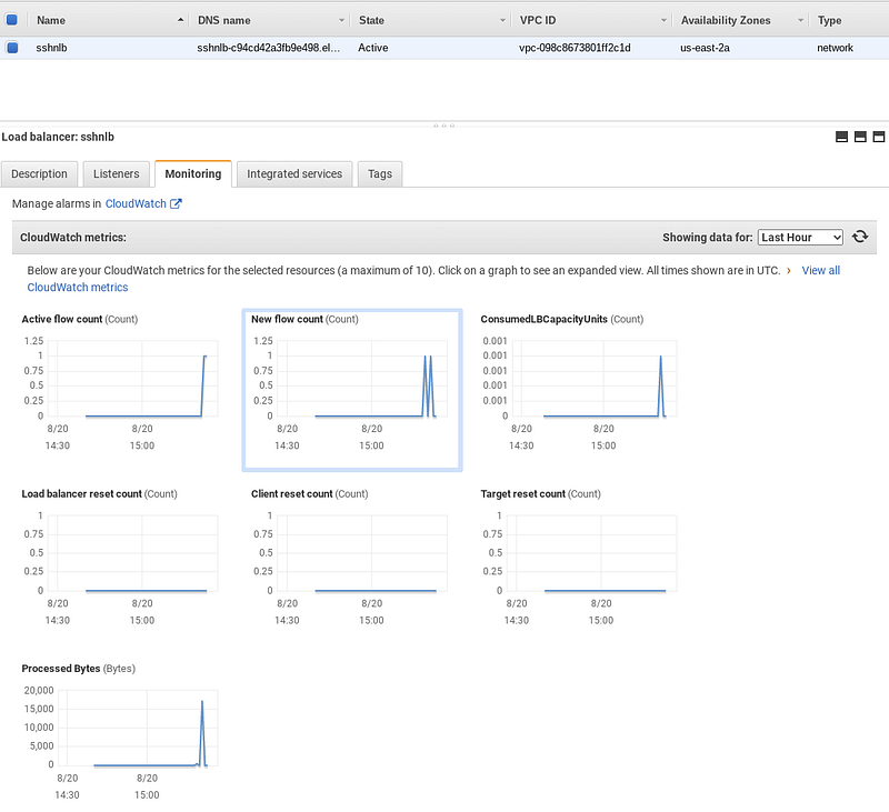 From this server I can first verify with Netcat. We’ll see the TCP connection flows in the CloudWatch metrics below.nc vpce-01568976ead95ca31-9gcn6mk0.vpce-svc-09f2d84e33bdc5fa7.us-east-2.vpce.amazonaws.com 22