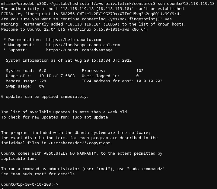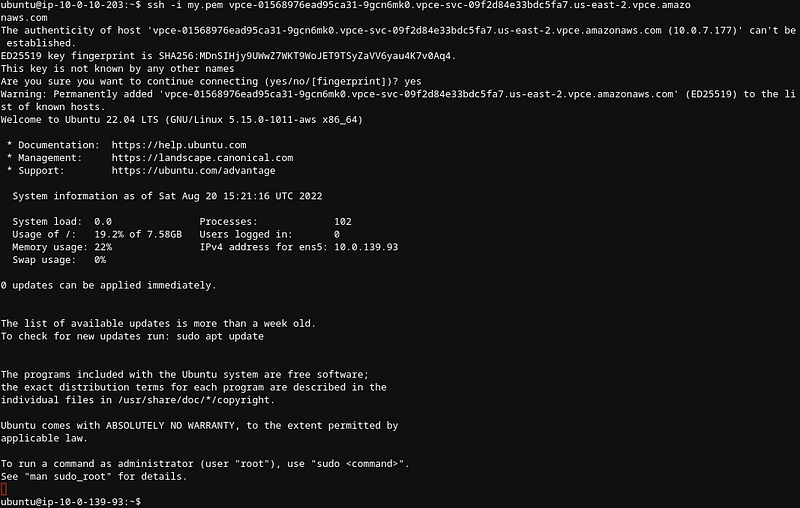 Next, SSH to the “client” SSH server that has a public IP address. Our remote SSH server on the other side of the PrivateLink connection and NLB does not and it is configured in the private subnet of the VPC.