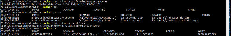 So let’s run some containers. What is interesting is that only the IIS image actually runs a process “ServerMonitor.exe w3svc” so it stays running while the smaller images stop. You will also not be able to run IIS interactively with the “-ti” option, like you can with the Nano or Windows Server Core images.