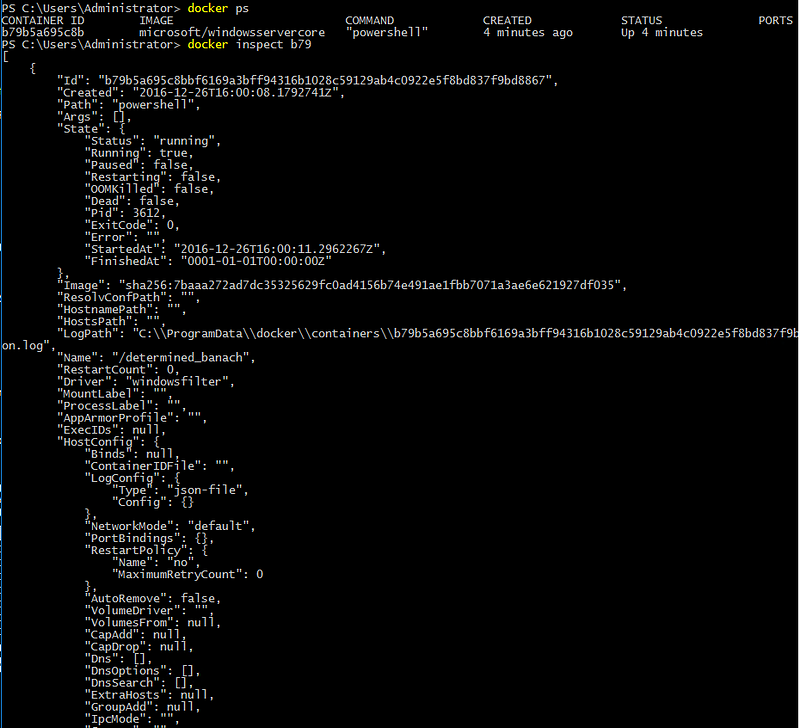 In general most of the commands work as you would expect except that instead of bash you are running cmd.exe or PowerShell and the usual strange Microsoft-isms, that I don’t get. I did seem to create more “dead” containers on Windows Server than on Linux, but restarting dockerd cleaned these up.