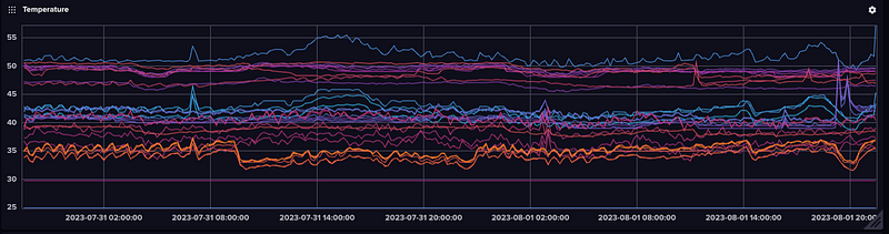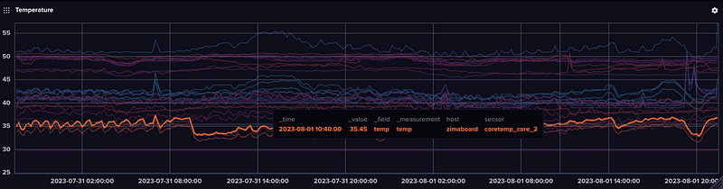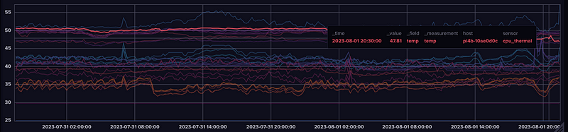 And we can see the Pi4B running InfluxDB is on the warmer side. Even with Argo Fan.