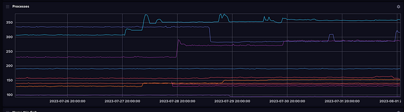 The easiest and most simple process monitoring allows you to see number of processes, processes in a given state (running, stopped, sleeping, etc.) and threads. There is more advanced configuration that can be used to get CPU and memory utilization of individual processes (collectd did this as well) but I don’t actually use that at the moment.
