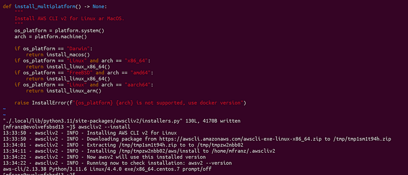 [mfranz@evolvefsbsd13 ~]$ python3.11 -m pip install awscliv2 --userAfter modifying the function install_multiplatoform() in installers.py