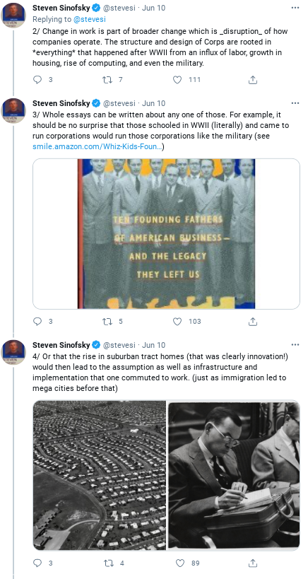 For the last month or so, Tech Twitter has all about the transition that is happening now and that will fully materialize in the Fall when companies implement their “Return to Office” policies. This afternoon, I happened to catch Re-entry Sucks which is one of the more thoughtful treatments of what is going behind the threats of quitting or calling people that are “entitled” for wanting to stay remote. A recent Twitter thread by Steven Sinofsky placed what is happening a broader set of changes dating back to World War II: