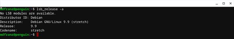 And to connect use vsh which will given you a non-privileged VM that allows you to create LXC containers inside — or just use the default Debian container called penguin. This is the container that you will access if you click on the terminal icon and I’ve found this to be good enough. It is the latest version of Debian.
