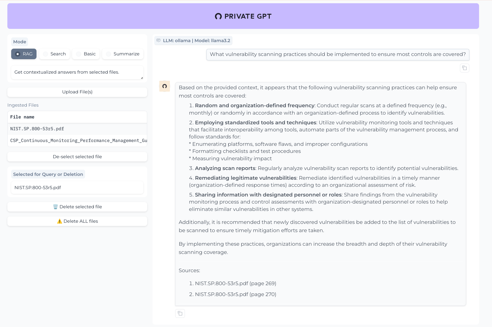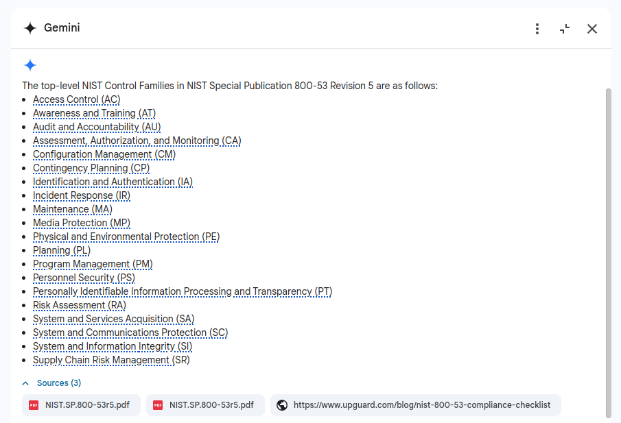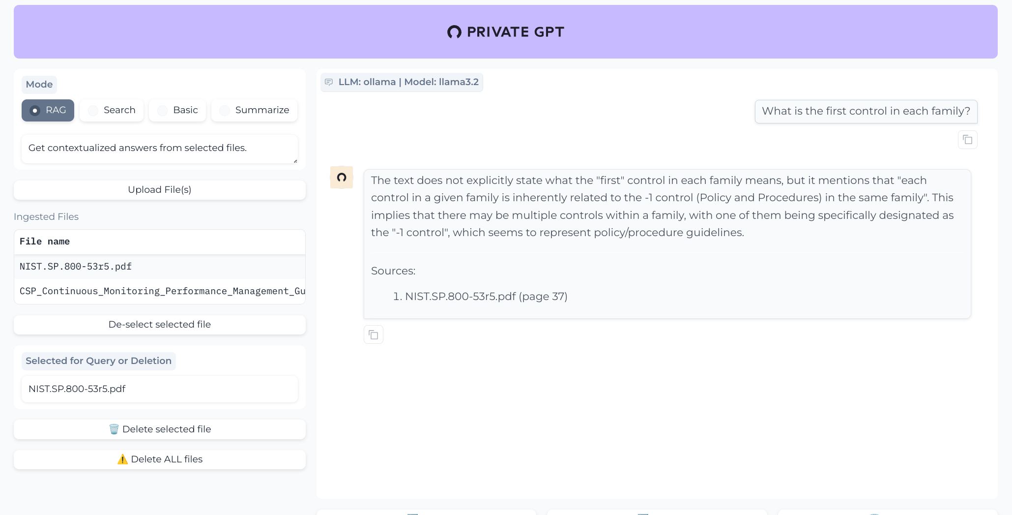 I've been using the "free" version of Gemini included with my ChromeBook plus for a few months but recently decided to upgrade to Advanced and testing with documents in my Google Drive and within Google Docs. The advanced version also gives you better image generation capabilities. In the past I'd ingested NIST 800-53 into PrivateGPT on my Mac M3 with mixed results and though I'd try again on my ASUS Nvidia 3060 I added to my son's old gaming PC this past week, where I had Ollama.