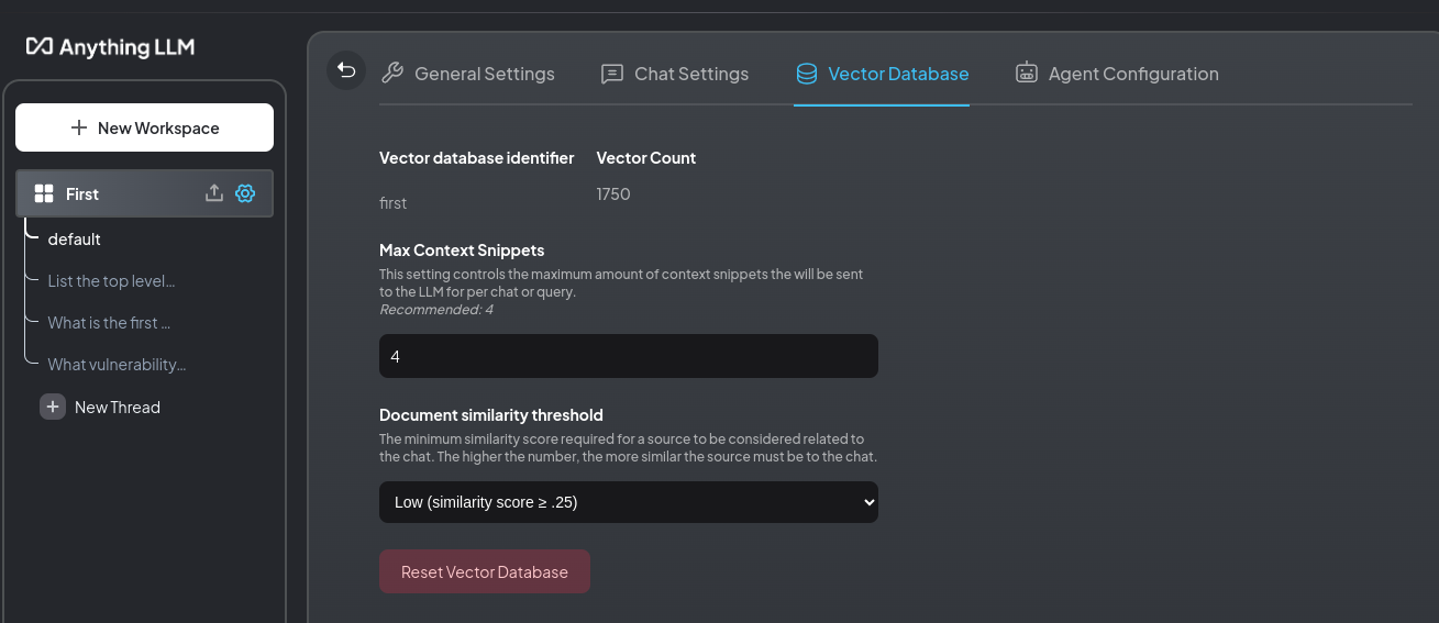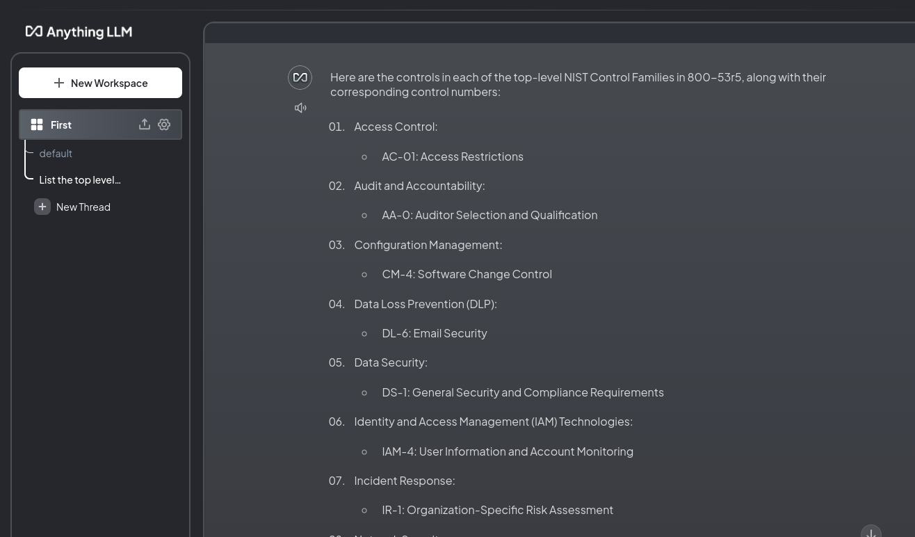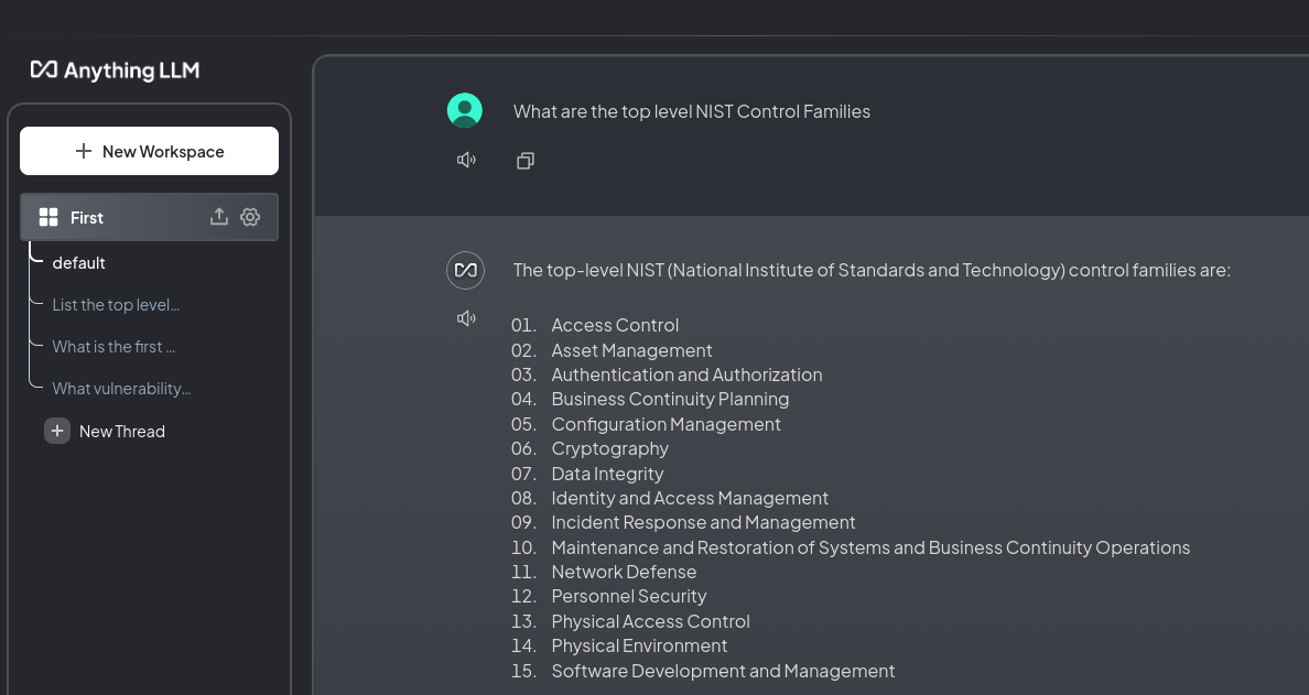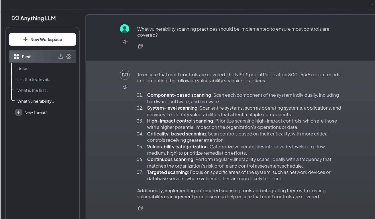 Like PrivateGPT, AnythingLLM returned a numbered bulleted list with short explanations. It did the best on this question compared to the others and I actually liked the fact that it capture system vs. component (even though it really doesn't understand what that means) as well as the idea that scanning should be continuous and that you should focus on most vulnerable systems. Given how poorly this configuration performed on the more basic questions, I surprised that it did this well.