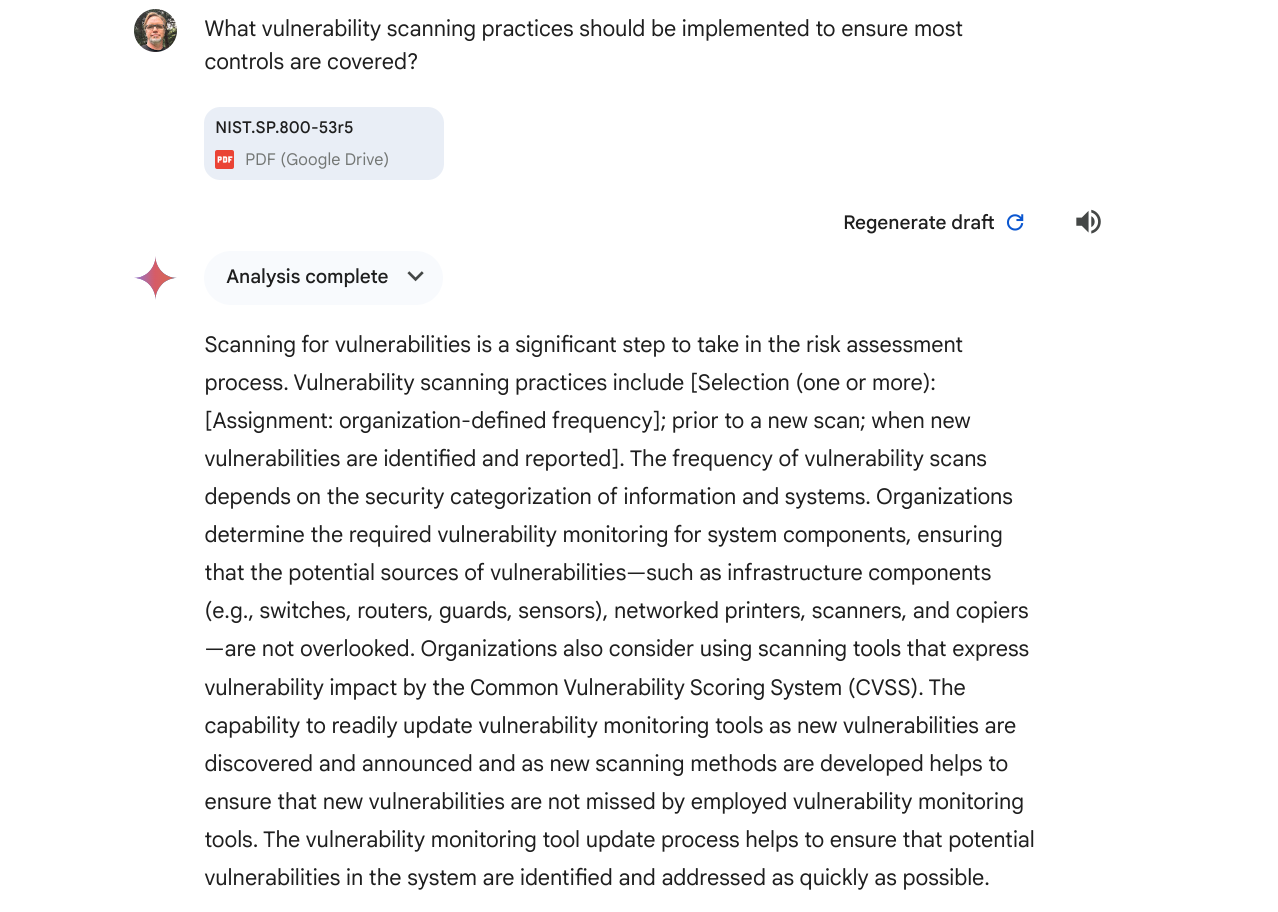 Shockingly, I found Gemini's response was the most "word salad" among the three, although it started off well, but went downhill, not really understanding "organization-defined frequency" which is littered throughout NIST 800-53. However, it did mention CVSS and that scanners needed to updated and did mention classes of assets (meaning scan targets) in reasonable manner.
